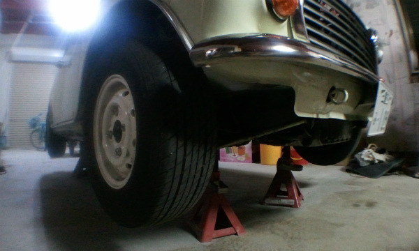 とりあえず ミニ-2号機 2013-05-08 ほっといたら半年くらいすぐに過ぎちゃいそうなんで、まずウマに載せました。 中腰作業が続きそうだからこれくらい上げてやるとちょいとは負担が軽減できるはず。。 次の作業はクーラント抜きかな。