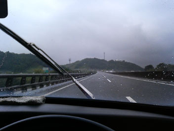 あいにくの雨の中、高速を2台のミニで走って行きます。